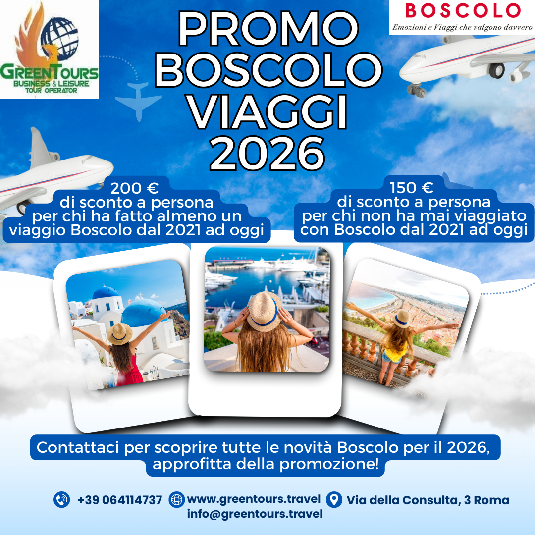 OffertePromo Boscolo Viaggi 2026Il 2026 è l’anno perfetto per partire verso nuove emozioni! Boscolo ti premia con sconti fino a 200€ a persona Fai le valigie, il tuo prossimo viaggio da sogno ti aspetta. Contattaci e blocca ora la tua offerta! 16 Dicembre 2025/da tyajima https://www.greentours.travel/wp-content/uploads/2025/12/Blue-and-White-Modern-Travel-Agency-Facebook-Post.png 1080 1080 tyajima http://www.greentours.travel/wp-content/uploads/2023/01/logo-green-tours-orizzontale-trasparente.png tyajima2025-12-16 16:01:582025-12-16 16:01:58Promo Boscolo Viaggi 2026